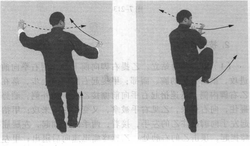 身体 右转;左腿屈膝下落,脚尖 稍内扣,随之身体重心移至 左腿;右腿屈膝提起,脚尖自然下垂;左腿自然伸直,形成左 独立势;同时,右臂屈肘右手向下、向内画弧转至胸前,掌心 斜向前,掌指斜向上;左臂屈肘,向内转至右腕上侧,掌心斜 向前,掌指斜向上;眼看右前方(图7-211、图7-212 )。图 7-211图 7-212