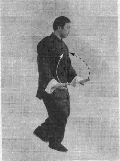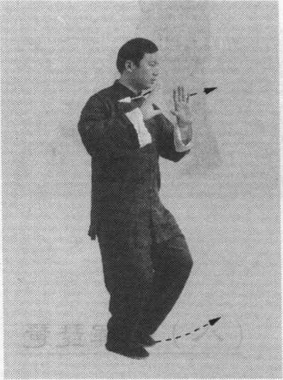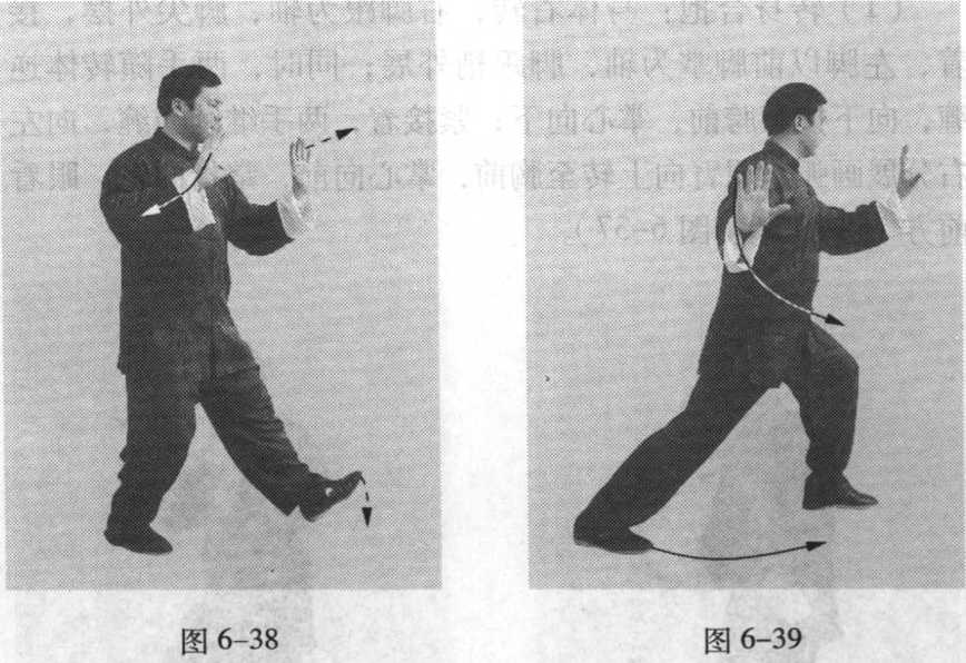 侧后方按出,掌心斜向右,掌指斜向上;眼看左前方(图6- 38、图 6-39)。