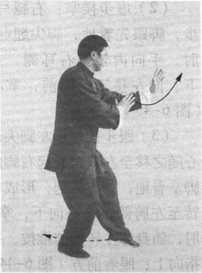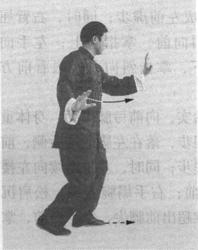 (2)弓步单鞭:身体稍左转;右腿弓膝塌劲,身体重心 仍在右腿;提起左脚向左侧前方上步,脚跟先着地,脚尖翘 起;随之,两肘下沉,两手稍向左右分展,与肩同宽;紧接 着,左脚前掌落地踏实,向前弓膝塌劲,右腿自然伸直,形 成左弓步;同时,左臂松肩沉肘,塌腕立掌,左掌随弓膝微 微向前推出,掌心向前,掌指向上,与鼻尖同高;右手向右