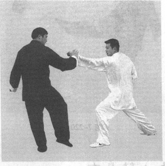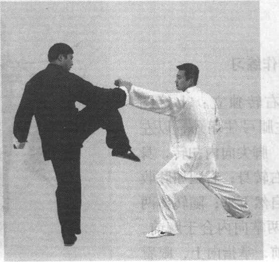 甲迅速抬起右手向前搠接乙左手腕外侧,顺乙劲向前引化,同时,右腿屈膝提起,右脚迅速发力 向前弹出,直踢乙的左腋下,将乙踢出(图7-218、图 7-219.图 7-220)。图 7-218