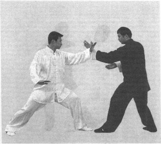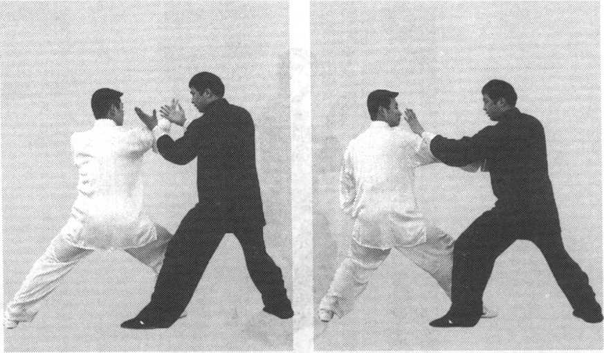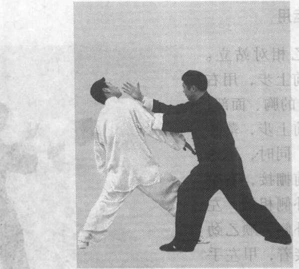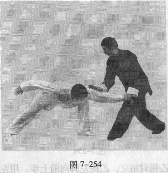(1)甲乙相对站立。 乙提右脚向前上步,用右 手向前进攻甲的胸、面部; 甲提左脚向前上步,落在 乙右脚外侧,同时,迅速 抬起双手向前搠接,右手 与乙右手腕外侧相接,左 手接乙右肘外侧,顺乙劲 向前引化;接着,甲左手 变逆缠按乙臂向下,右手 松开,迅速向乙面部进攻, 将乙打出(图7-249.图图 7-250 图 7-251图 7-2527-250、图 7-251、图 7-252)。图 7-253