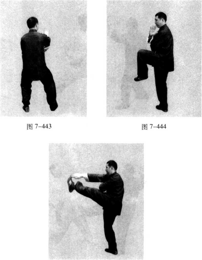(1 )接上势的图7-440。身体左转,右腿弓住塌劲,右脚 跟为轴,脚尖向内扣转,重心仍至右腿,左脚跟提起,向内拧 转,形成左前虚步,紧接着,左腿屈膝提起,脚尖自然下垂, 右腿自然伸直,形成右独立势;同时,左手向右经右臂下侧转 出至右肩外前侧,掌心向外,掌背贴于上臂外侧,掌指向上, 右臂随转体,屈肘,手向左转至左肩前,掌心向外,掌指向 上,眼看前方(图7-443、444)。