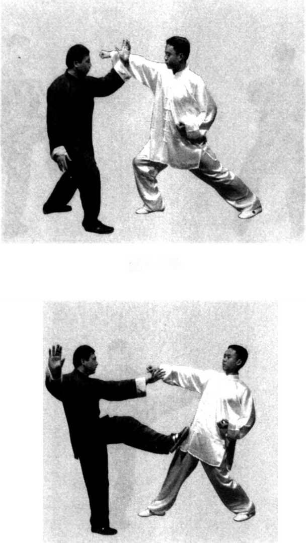 门,脚落在甲的两脚之间,双手握拳,用右拳向甲胸、面部打 出;甲提起右脚向前上步,脚落在乙右脚的左前侧,抬起左手 向前棚接乙的右腕内侧,向左引釆,接着,左腿屈膝提起,用 左脚摆击乙的头部,将乙打出(图7-446、447)。