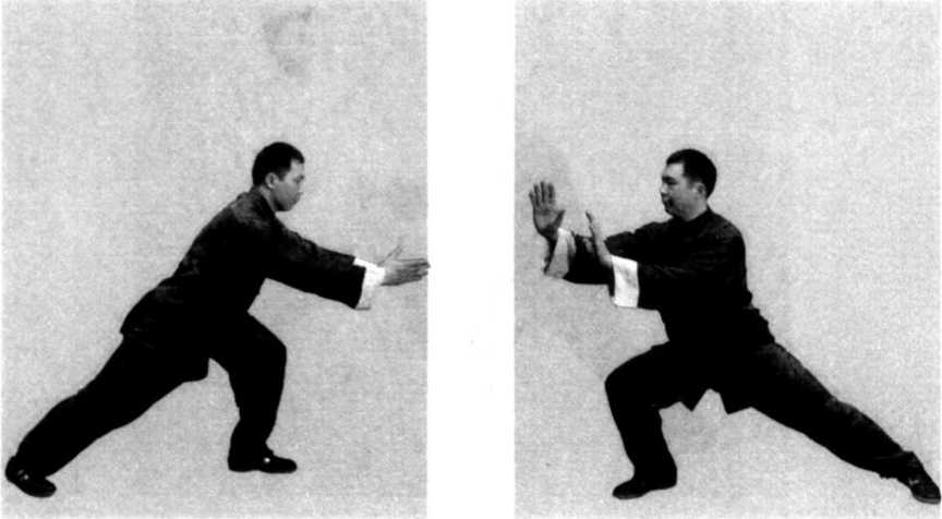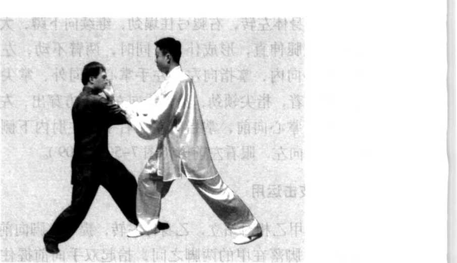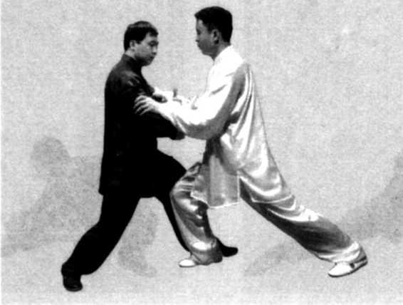 (1)甲乙相对站立,乙身体左转,提起右脚向前上步,踏 甲中门,脚落在甲的两脚之间,抬起双手向前握住甲的两上 臂,用力向前推按;甲双手由下向上棚至乙的两前臂下侧,随 之,提起左脚向前上步,脚落在乙右脚外侧,接着,右手向左 转至乙右腕外侧,左手逆缠向下贴乙右臂下侧向外转至右肘外 侧,紧接着,右腿屈膝下蹲,左腿伸直,形成左仆步,右手握