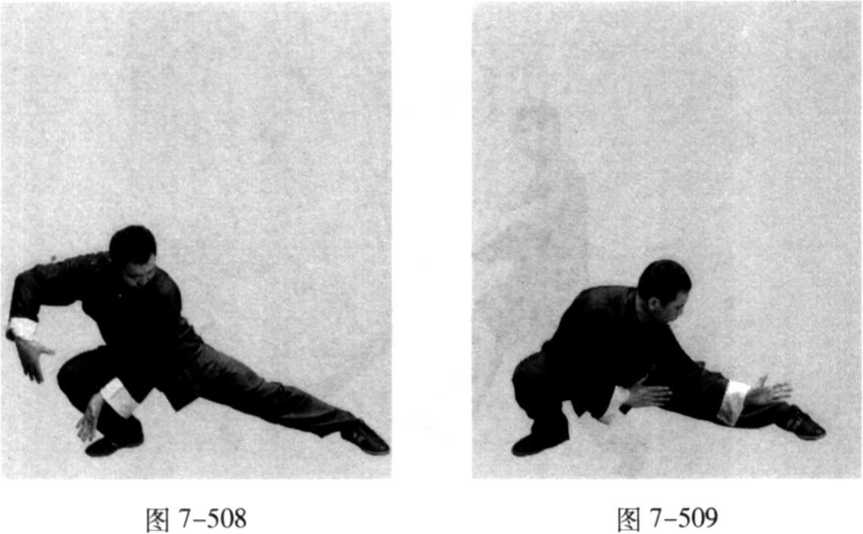(2)身体左转,右腿弓住塌劲,继续向下蹲,大腿与小腿 贴紧,左腿伸直,形成仆步;同时,两臂不动,左手向内屈 腕,掌心向内,掌指向左,左手掌心翻向外,掌尖斜向左前 方;紧接着,指尖领劲,沿弧线向左侧下方穿出,左手至左小 腿内侧,掌心向前,掌指向左,右手至左肘内下侧,掌心向 内,掌指向左,眼看左前方(图7-508、509)。