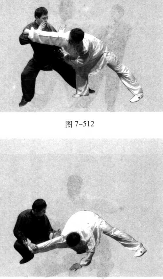 拿乙右腕,向右下方采拿,左手随右手向右下方捋转,迫使乙 向前扑跌(图 7-510、511、512、513)。