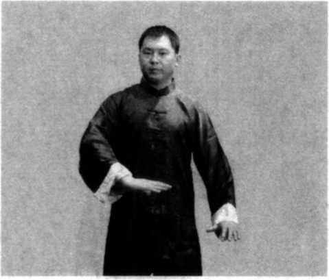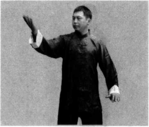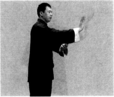 6. 抹掌:右掌心向下或斜向下,向左斜前方出手,向右 平抹,掌指向前或斜向前,左右相同,方向相反(图4-9)。