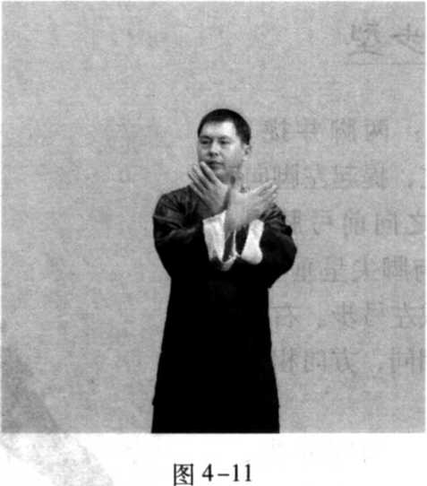 7. 提手:屈腕,从小手指依次向内扣,屈肘向上提起, 手至右额前,掌心斜向内,掌指斜向前下方(图4-10)。