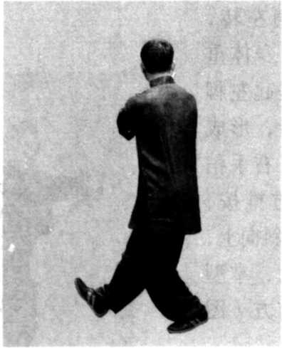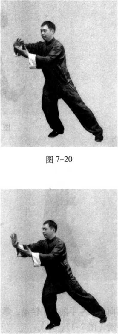 图 7-21向左斜后方撤步,形成 心G步;问时,右手稍 逆缠向右斜前方推按, 掌心向前,掌指斜向上, 左手随右手转动,掌型 不变,眼看右前方(图 7-20、21 )〇
