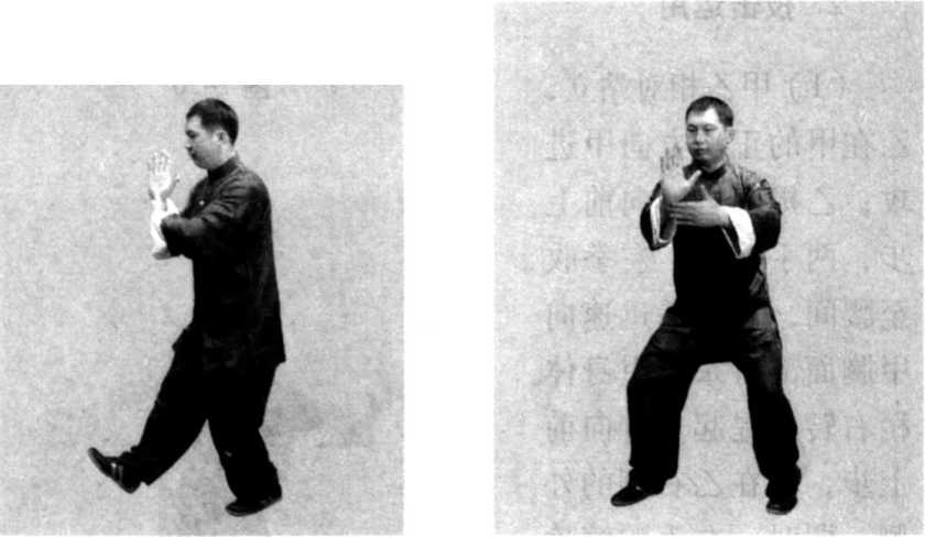 (9) 身体稍左转, 右腿弓住塌劲,身体重 心移于右腿,提起左脚