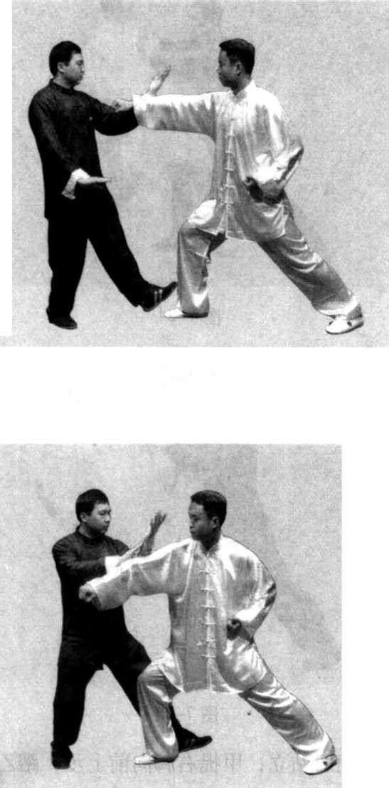 (1 )甲乙相对站立, 乙在甲的正前方向甲进 攻;乙提起右脚向前上 步,两手握拳,左拳收 至腰间,用右拳迅速向 甲胸面部打来;甲身体 稍右转,提起左脚向前 上步,落在乙右脚的外 侧,同时,左手顺缠抬 起,用前臂内侧棚接乙 右前臂外侧,顺乙劲向 前引化,接着,左手变 逆缠屈肘向前挤出,右 尹抬起按在左手腕内侧, 以助左手的挤势,随之