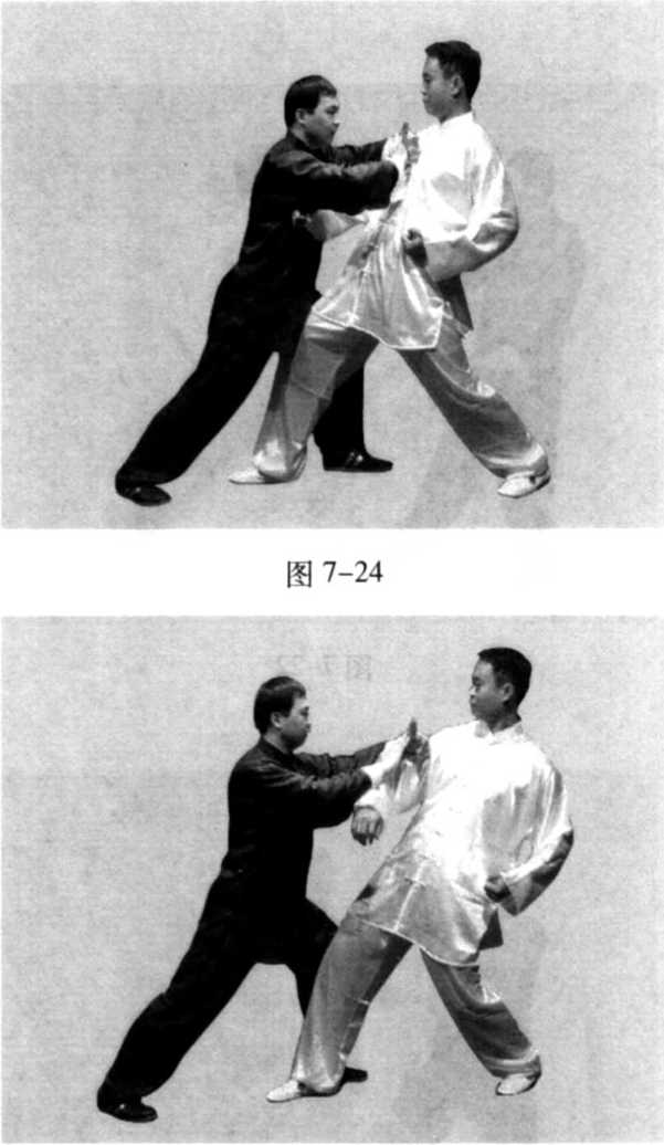 向前弓膝塌劲,将乙挤出(图7-22、23、24、25)。