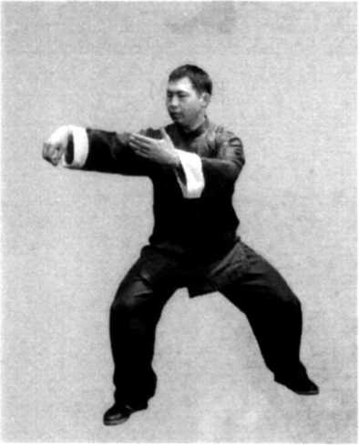 图 7-33 2.技击运用图 7-34接上势的图7-21。身体左转,左腿弓膝塌劲,身体重心 移至两腿之间,形成马步;同时,右手五指捏拢,屈腕,指尖 向下,形成勾手,左手掌心向内,向左云转至左侧前方,手变 逆缠向左斜前方推按,掌心斜向左前方,虎口向上,掌指斜向 上,眼看左前方(图7-33、34)。