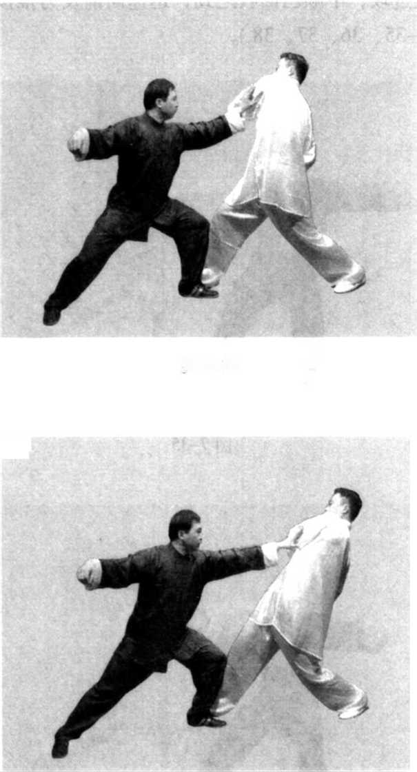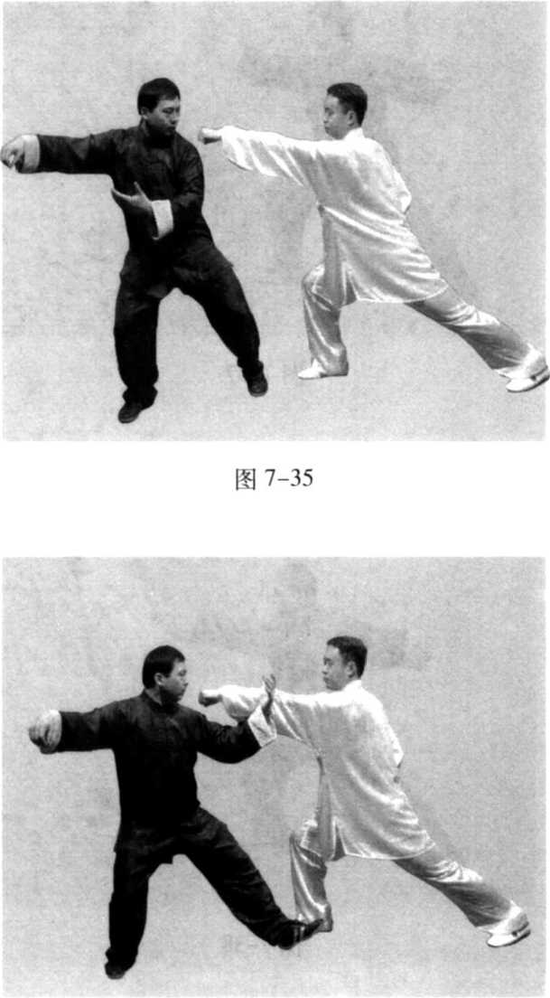 的左肘外侧,逆缠向左后方引化;乙见左拳落空,意想收回左 拳,再次进攻;甲顺乙回收之劲,迅速向前发力推按,将乙按 出(图 7-35、36、37、38)。