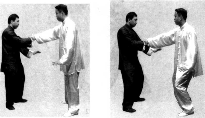 (1 )甲乙相对站立,乙用右手向前进攻,握住甲的右手 腕;甲右手向前上棚至胸前,接着,身体右转,右腿弓膝塌 劲,身体重心移至右腿,提起左脚向前上步,踏偏门,脚落在 乙右脚的外侧;同时,右手向右侧上方转提,将乙右臂引直, 接着,左脚尖落地踏实,向前弓膝塌劲,与此同时,右手向前