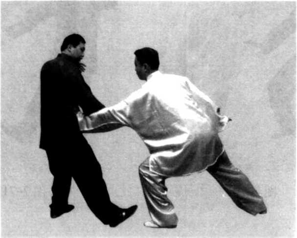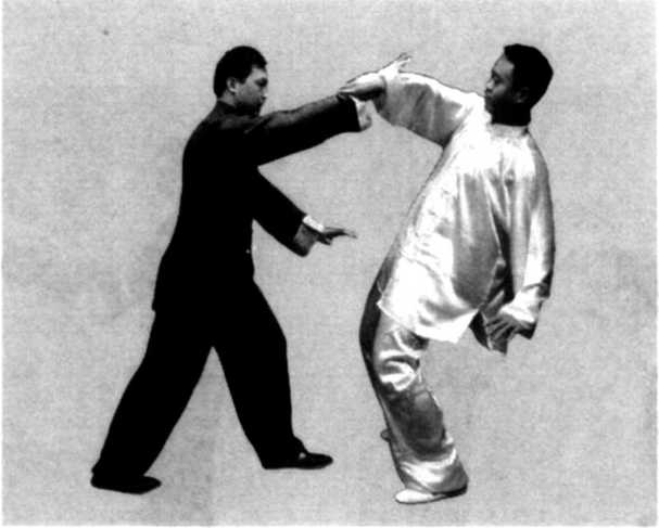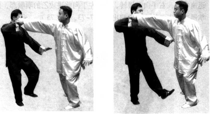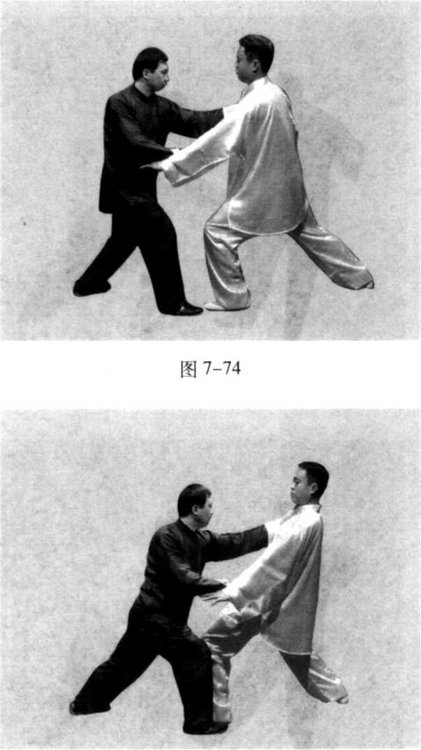 (2) 甲乙相对站立,甲身体左转,提起右脚向前上步,意 想用右手向前进攻,乙见甲右肋部有空隙,迅速提左脚向前上 步,抬起左手向前推按甲的右肋侧;甲见右肋侧被袭击,身体 迅速右转,右手向右搂转,抬起左手向前进攻乙的咽喉部,用 掌迅速推击,使乙向后仰出(图7-73、74、75)。