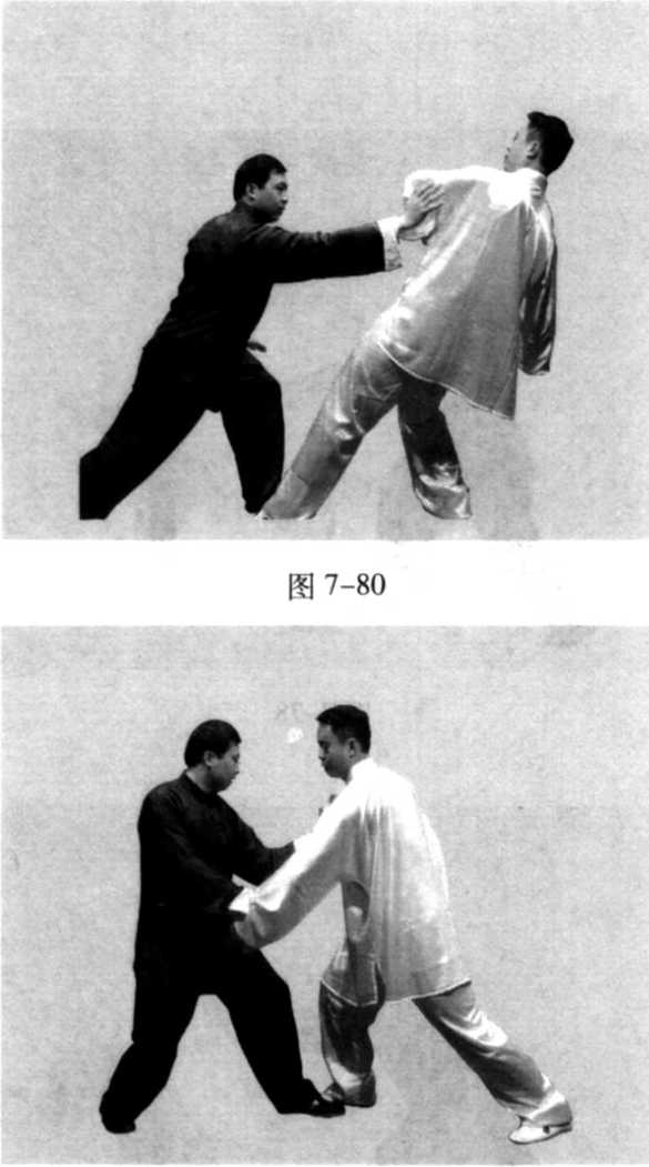 图 7-76图 7-77起右手向前推按乙的左臂后侧,使乙向后仰出(图7-76、77、 78、79、80)。图 7-78图 7-81