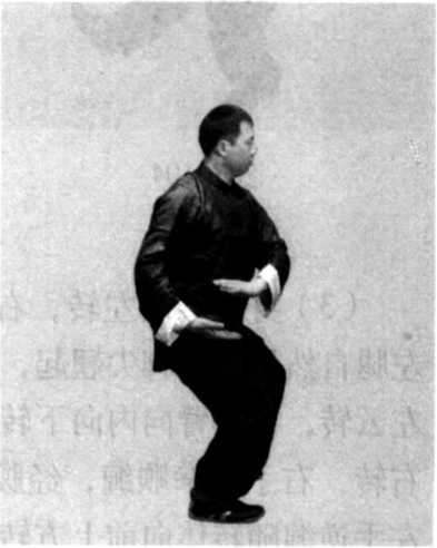 (1) 图 7-103接上势的图7- 91。身体稍右转,两腿 屈膝下蹲,成马步;同 时,左手逆缠屈臂向右 经胸前向下按至右侧胯 前,掌心向下,掌指斜 向右后方,右手顺缠, 转至左掌下侧,两掌心 相对,掌指斜向前,眼 法不变(图7-103)。