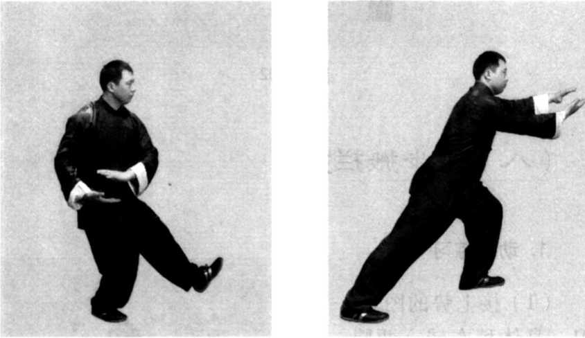 (2) 身体稍右转,右腿弓住塌劲,身体重心移至右腿, 提起左脚向前上步,落于右脚的左前侧,脚跟先着地,脚尖 翘起,形成左前虚步;接着,身体左转,两手沿弧线向左前 上方转出,左手与肩同高,掌心向下,掌指斜向前,右手仍 至左手下侧,掌心相对;同时,右脚尖落地踏实,向前弓膝 塌劲,右腿自然伸直,形成左弓步,上体随之前倾(图7- 104、105)。