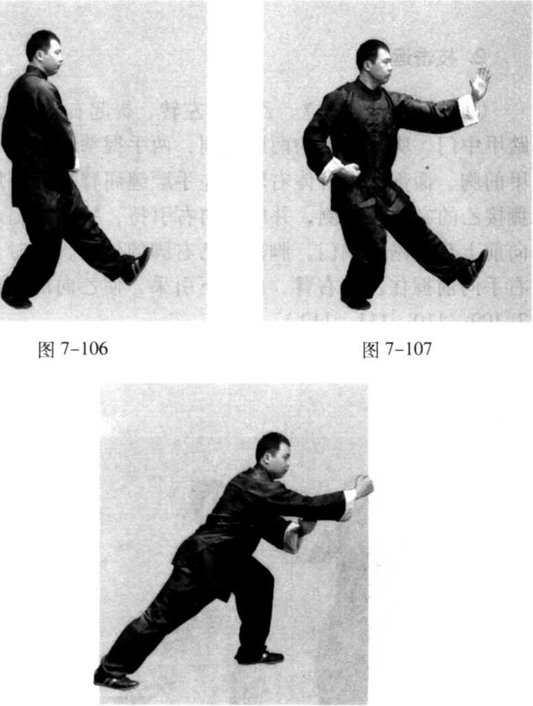 (4) 身体稍左转,左脚尖落地踏实,向前弓膝塌劲,右腿 自然伸直,形成左弓步;同时,右拳以拳面领劲,经左前臂下 侧向前打出,力达拳面,左臂随之屈肘,左手向内转至右肘内 侧,掌心向右,掌指向上,与此同时,上体前倾,眼法不变 (图 7-108)。