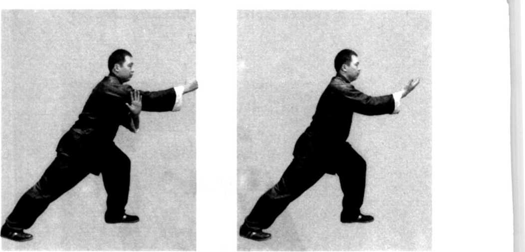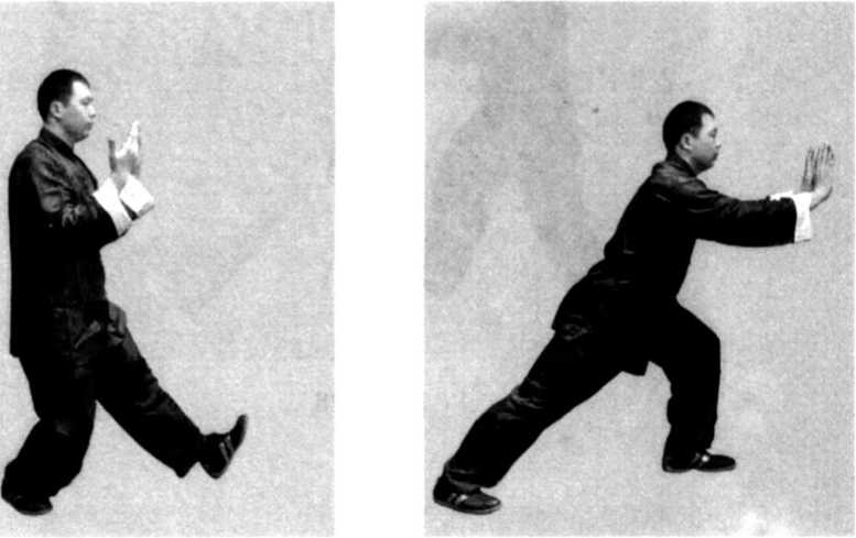 (2) 图 7-124 图 7-125身法不变,右腿屈膝塌劲,身体重心移至右腿,左 腿自然伸直,脚尖翘起,形成左前虚步;同时,两臂屈肘, 两手向内屈至胸前,掌心向内,掌指向上;接着,两手逆缠 掌心翻向前,紧接着,两手向前推按,掌心向前,掌指向上,