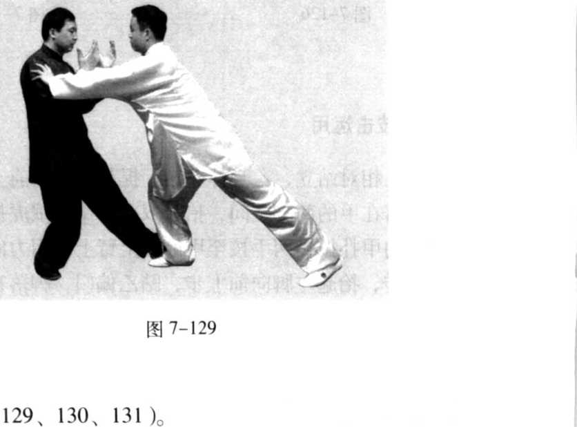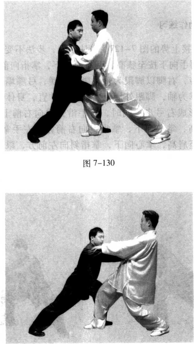 实,向前弓膝塌劲,形成左弓步,上体前倾,眼看前方(图 7-126、127)0