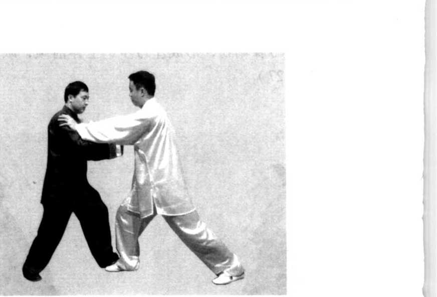 甲乙相对站立,乙身体左转,提起右脚向前上步,踏甲中 门,脚落在甲的两脚之间,抬起双手,用“饿虎扑食”势,两 手迅猛向甲扑按,两手按至甲的两上臂上,用力向前推按;甲 身体右转,抬起左脚向前上步,踏乙偏门,脚落在乙的右脚的 外侧,迅速抬起双手,棚乙两前臂下侧,顺乙的按势,身体稍 向后倾,两手转至乙的两臂内侧,向左右转开,以化解乙的按 势;乙见按势落空,意想回收两手,伺机进攻;甲左腿屈膝前 弓,两手向前按乙胸部,两手同时发力向前按出,将乙发出