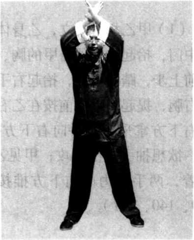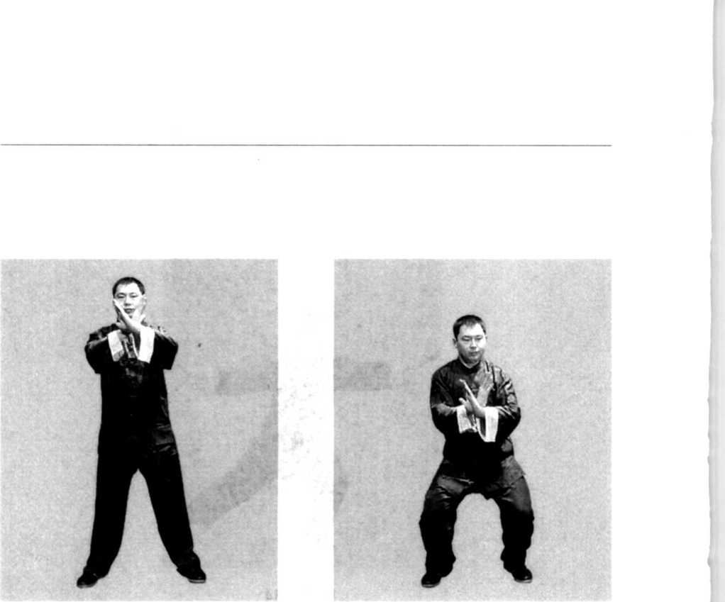 图 7-134形成开立步;同时,两 手顺缠沿弧线向上转至 额前上方,两手腕交叉 相搭,左手在外,右手 在内,掌心斜向外,掌 指斜向上;接着,两腿 屈膝下蹲,形成马步; 与此同时,两肘向下松 垂,两手向下转至胸前, 掌型不变,眼看前方 (图 7-135、136、137)0
