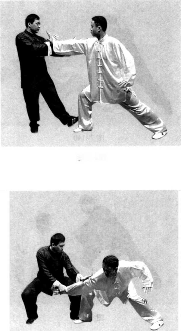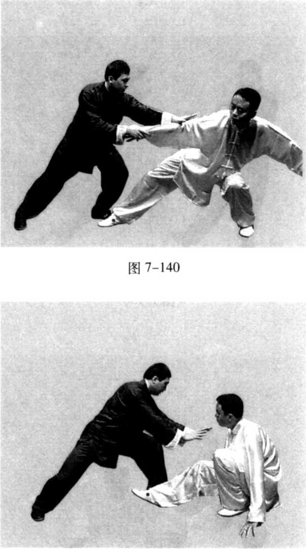 (1) 甲乙相对站立,乙身体左转,提起右脚向前上步,踏 甲中门,抬起右掌猛击甲的胸、面部;甲身体右转,提起左脚 向前上步,踏乙偏门,抬起右手向前棚接乙右腕外侧,并拿握 乙右腕,提起左手向前按在乙右肘外侧;两腿屈膝下蹲,右手 向右下方拿采,左手向右下方捋采;乙见右手落空,又被拿 住,欲想抽手再次进攻;甲见乙劲有变化,迅速随乙劲变化, 接着,两手发力向前下方推按,使乙向后仰跌(图7-138、 139、140、141)。