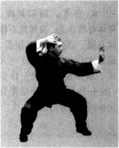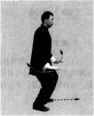 (2) 身法不变,两腿屈膝下蹲,两膝向前屈,随之,松腰 坐胯,形成马步。上体保持中正。同时,两手徐徐向下按至两