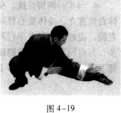 4. 图 4-18仆步:两脚并拢, 身体自然直立,身体重心移 向右腿,屈膝下蹲,接着, 提起左脚向左平行开一大 步,腿伸直,形成左仆步 (图4-19)。右仆步动作完 全相同,惟方向相反。