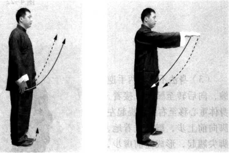 (1) 两脚并拢,身体自然直立,身体重心移向右腿,提起 左脚向左平行开步,与肩同宽,接着,两手逆缠向前上方举 起,与肩同宽同高,手心向下,手指向前,眼看前方(图4- 20、21)〇