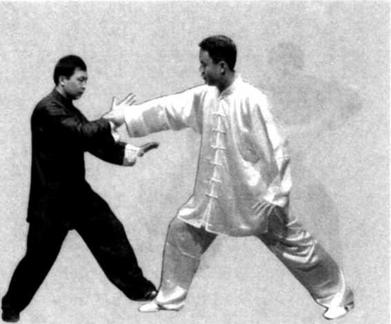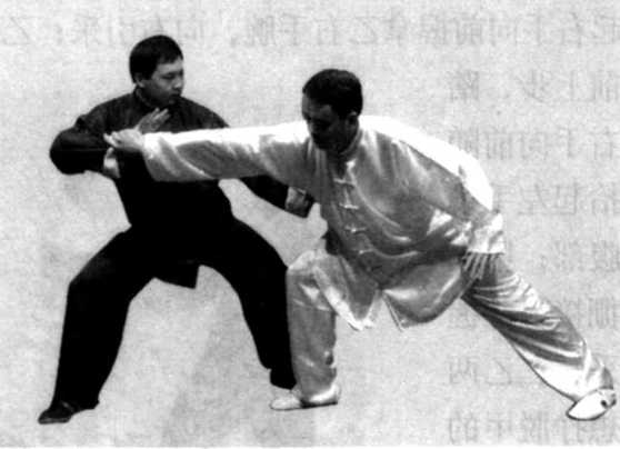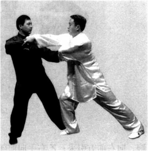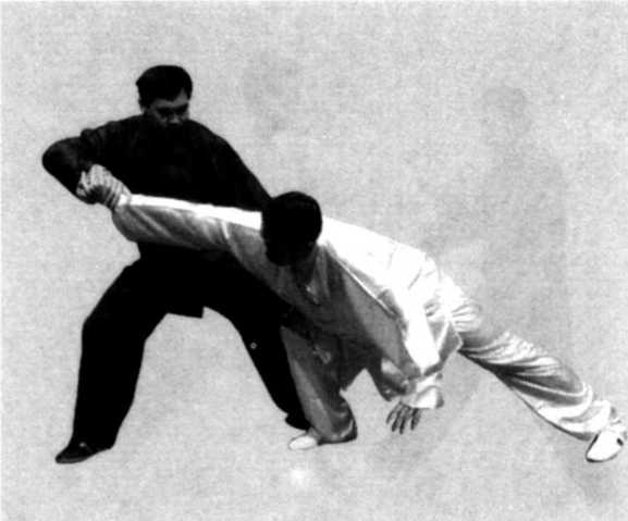 腕,向右前方引采;乙右手向前随甲的采势,甲左手猛击乙的 右肋部,将乙击出(图7-142、143、144)。