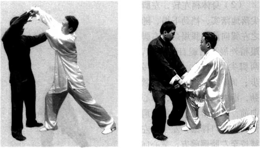 (2) 图 7-145图 7-144甲乙相对站立,甲身体右转,提起左脚向前上步,踏 乙中门,抬起右手向前握拿乙右手腕,向右引采;乙身体左转, 提起右脚向前上步,踏 甲的中门,右手向前随 甲的采势,抬起左手袭 击甲的胸、腹部;甲迅 速抬起左手棚接,并握 拿乙腕向左采转;乙两 手向上,意想挣脱甲的 两手,甲随乙势两手向 上,接着两手迅速向下