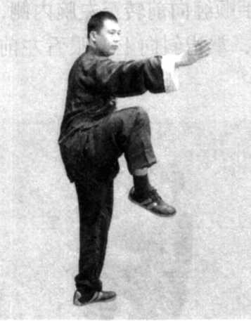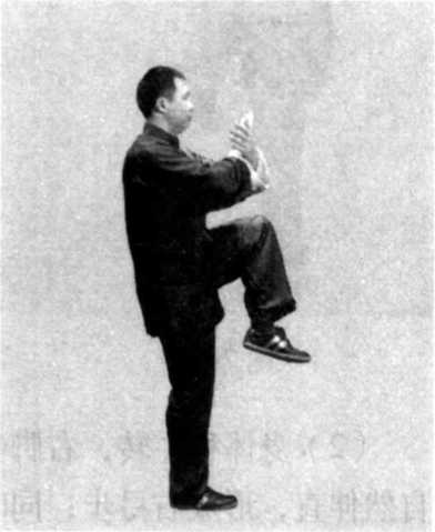 (5) 身法不变, 左腿屈膝提住,脚尖 自然下垂,仍为右独 立势;两手在原处不 动,掌型不变,眼法 不变(图7-379 )。