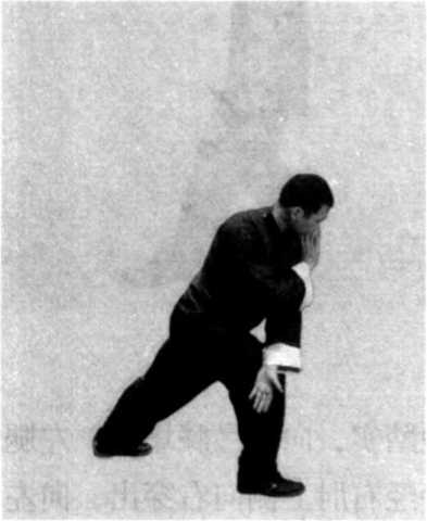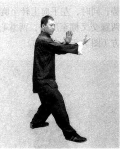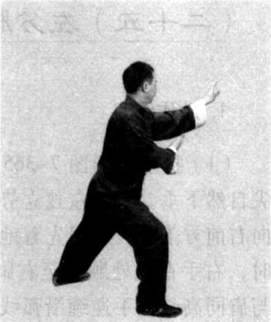 (2) 身体稍左转,右脚尖落地踏实,向前弓膝塌劲,左腿 自然伸直,形成右弓步;同时左手经右肘上侧向右穿出,向左 经右手上侧平云画弧转至左侧前方,掌心向下,掌指斜向左前