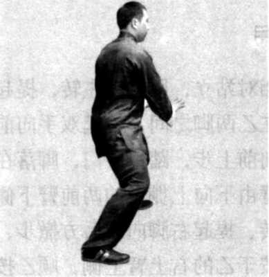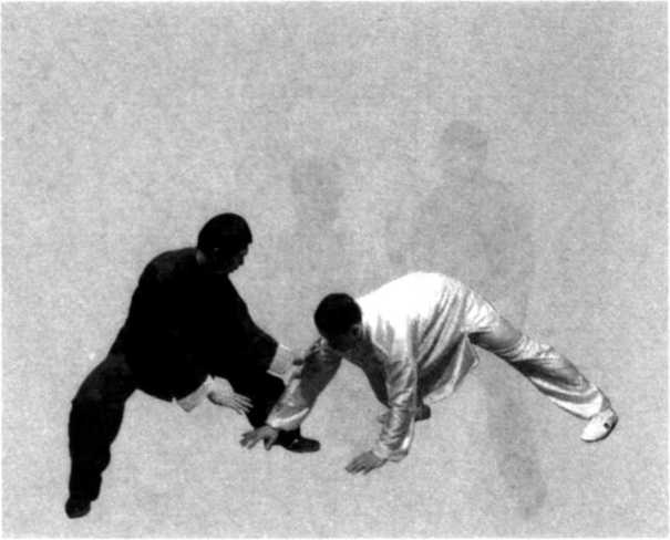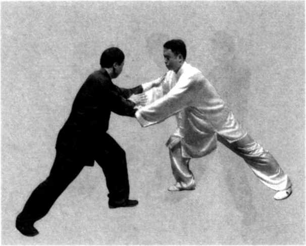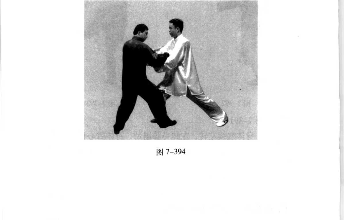 (1) 甲乙相对站立,甲身体左转,提起右脚向前上步,踏 乙中门,脚落在乙两脚之间,抬起双手向前推按乙的胸部;乙 迅速提起右脚向前上步,踏甲中门,脚落在甲右脚内侧,抬起 双手,用两前臂由下向上棚甲的两前臂下侧,两手顺势向前推 按;甲身体左转,提起右脚向右后方撤步,右手向左转至乙右 腕上侧,左手按于乙的右上臂上侧,顺乙按势迅速向右下方捋 转,使乙向前扑跌(图7-394、395、396)。
