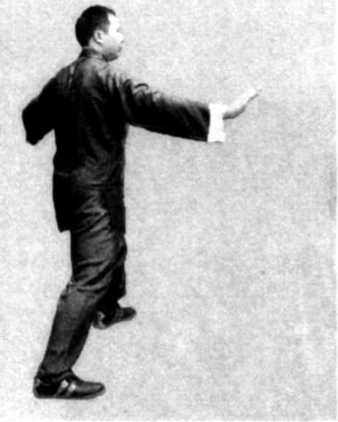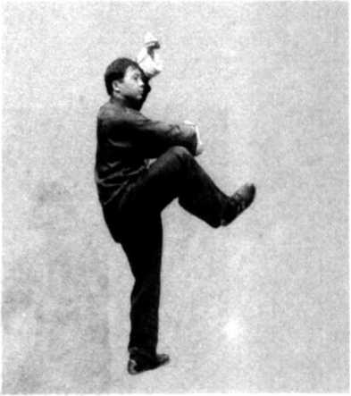 (5) 身体继续左转,左腿弓膝塌劲,身体重心移至左腿, 右腿屈膝提起,脚尖向内扣勾,左腿自然站直,形成左独立 势;同时,两手逆缠向左右分展,转至胸高,握拳;右臂屈 肘,右拳顺缠向内转至胸前,拳心向内,拳眼向上,左臂屈 肘,左拳继续逆缠,向上转至额前上方,拳心向前,拳眼向 下,眼看前方(图7-392、393)。