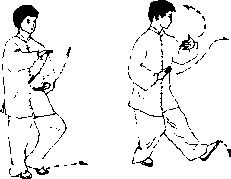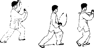 (1)重心移至右腿并屈蹲,左脚提收于右脚前,脚 尖轻轻点地;同时上体微右转,两掌上下合抱于胸前, 右掌在上,高与胸平,左掌在下,高与腹平,掌心相对; 眼看右前方(图50)。
