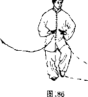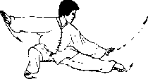 【过程】(1)右脚以脚跟为轴内扣,左脚以前脚掌为轴外 碾,重心偏右腿;身体左转(朝正南);两掌随转体向左 带于胸前,稍屈肘,内收;眼看正南方(图185)。(2)重心移至右腿并屈蹲,左脚提起;两掌下按于 腹前(图186).(3)左腿向左伸出成左仆步;两掌向左右分掌穿 出,掌心朝下,指尖分别朝左、右,右掌同肩平,左掌同 腹高;眼看左手方向(图187)。(结束动作定势朝东。)图1871要点]仆步与穿掌要同时,协调一致,左掌臂与左腿上 下相照;左右分掌时,两上臂外旋,指尖领先朝侧穿 出;上体不要过于前倾。