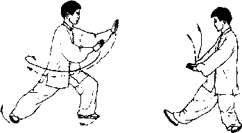 (2)左脚内扣,右脚尖翘起外摆,右脚跟着地,重 心仍在左膝,身体右转;两掌随体转向右下捋至腹前, 掌心均朝下(图200)。