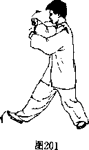 (3)左掌握拳提至胸前,右掌握于拳提至右肩前, 两臂内旋,拳眼均斜朝下,眼看右拳(图201)。