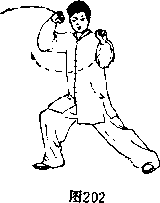 (4)右脚掌落平,重心移向右腿,屈膝前弓成右弓 步;身体左转;右拳向上架于右额角,左拳向上经面前 向左弧形打出,高于肩平,拳眼斜朝上,眼看左拳方向 (图202)。(结束动作定势朝西偏南。)