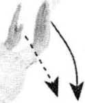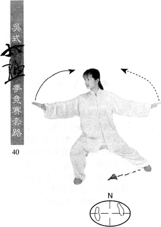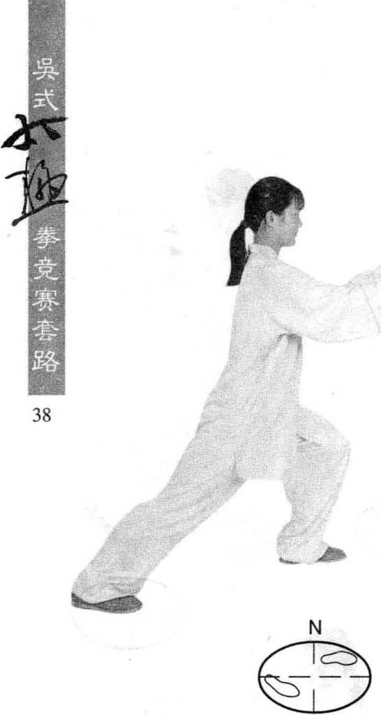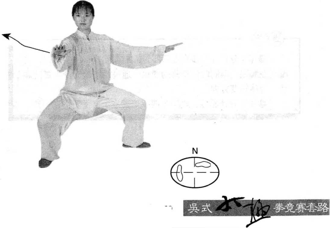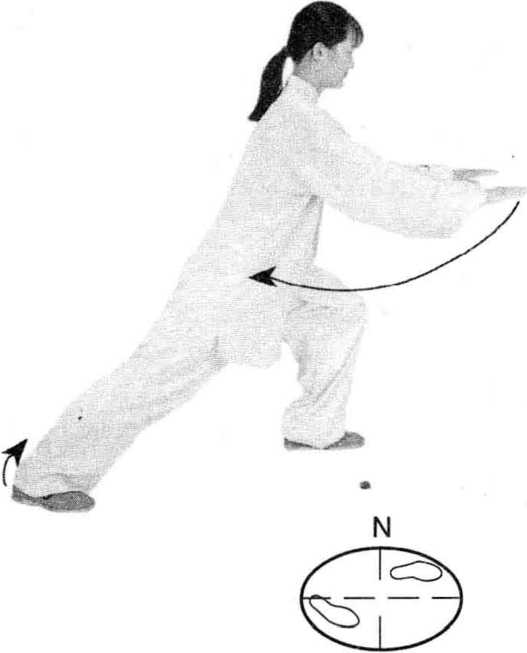 两手下按落于体前,高 与腹平,指尖向前;右脚掌向 右碾转,两腿屈膝半蹲并使 身体右转(胸向南),经马步 重心右移;左脚掌向右碾转 成右弓步;同进,两手左、右 平分成前侧举,手心均向下; 眼看右手。