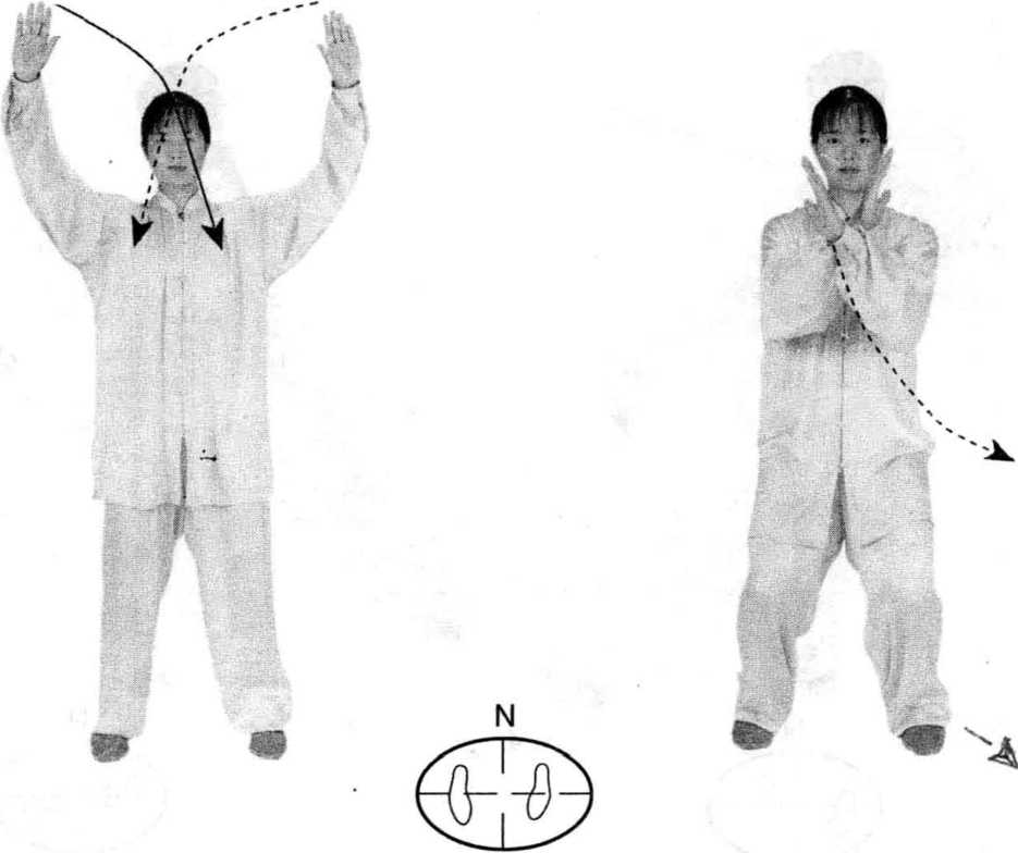左手穿至右上臂下,塌腕, 手指上翘,手心向右,然后经肘 下前伸出;同时,右臂微屈,右 拳变掌回收,当两手收至胸前 时,两腕相搭,左手在外,右手 在里,手心均向内;重心后移; 右腿屈膝半蹲,左脚尖翘起;同 时两手左、右分开收举于两肩 前,腕同肩高,两手略宽于肩, 两臂屈肘下垂;眼看前方。
