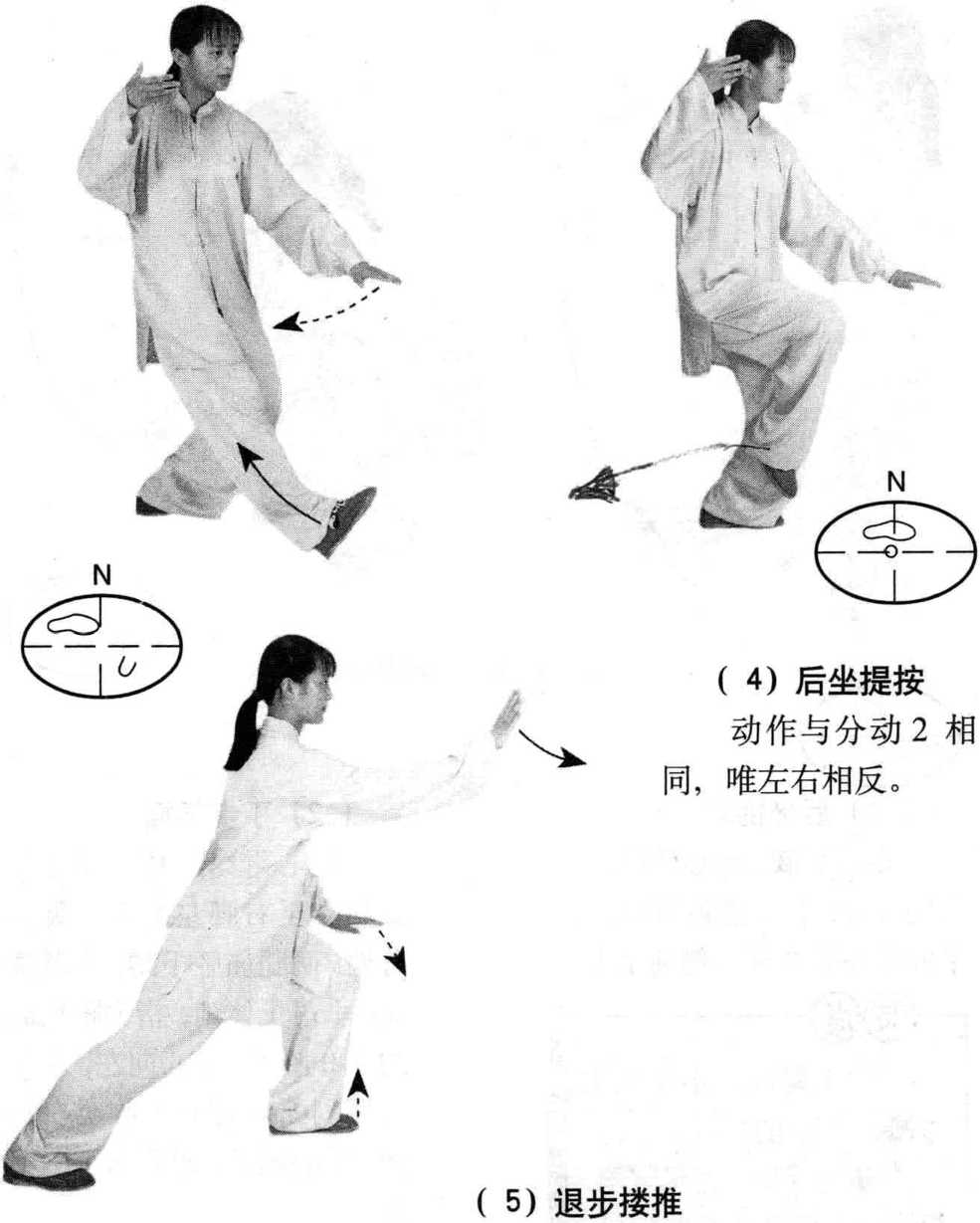 重心全部移至右腿;左 腿屈膝提起向后落地成右弓 步;同时,左手向前推出;右 手搂至右膝外侧上方;眼看 左手。动作与分动3相同,唯 左右相反。动作与分动3相同,唯 左右相反。动作与分动3相同,唯 左右相反。动作与分动3相同,唯 左右相反。
