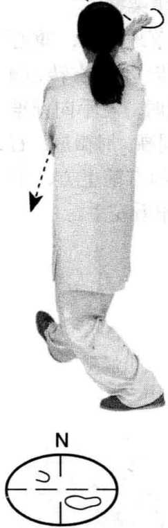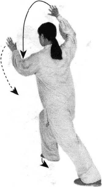 左腿屈膝,重心后移; 右脚尖翘起;上体右转;随 之右手屈臂向右旋腕,至肩 右前上方,手心斜向上;接 着,上体左转,右手再内旋 屈肘上举至右额前;左手收 于左腰间,手心向上;眼随 视右手,最后看右前方。