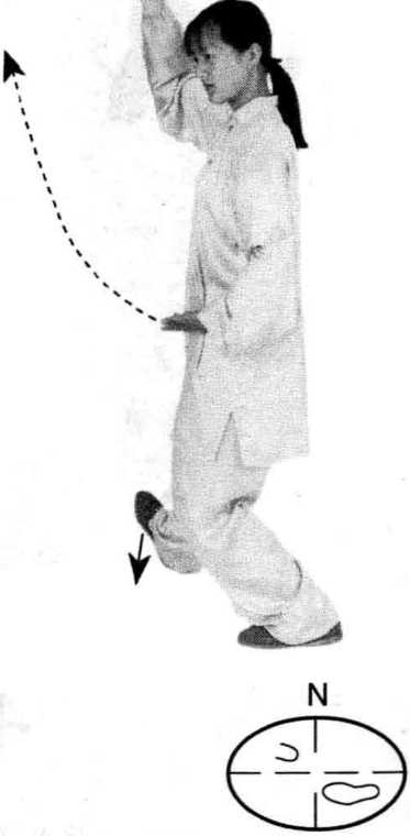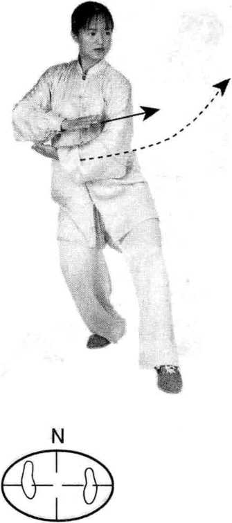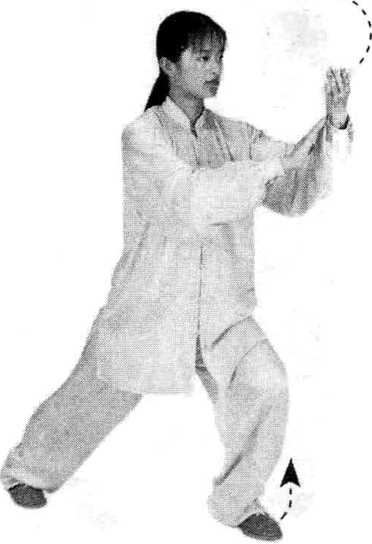 右脚向右落步,重心慢 慢形成右弓步;上体右转(偏 向西北);随之右手向右、向 上划弧举至体前,手腕同肩 高;左手仍附于右前臂内侧; 眼看右手。