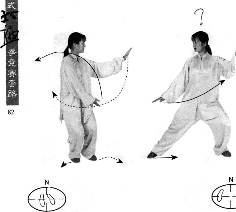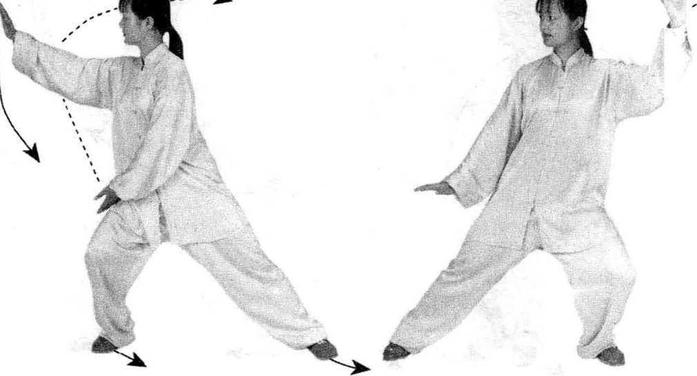 重心后移;右脚外摆;左 脚向左后方稍撤步,脚尖内 扣,与右脚平行;身体随之右 转(胸向西南)成右横弓步; 同时右手微外旋,随转体向 右平摆举于右肩前上方,腕 略高于肩,左手经体前向下 划弧落于左胯旁,手心斜向 下;眼看左前方;动作不停, 上体右转(胸向西南),随之 右手内旋,手心翻向下,向右 前方伸出;左手外旋,手心向 上,经腹前向右上方划弧至 右肋前;眼看右手。