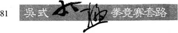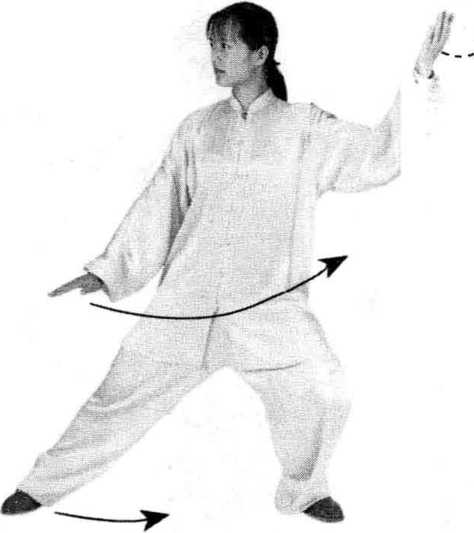 左脚外摆,右脚里扣,左 腿屈膝,重心后移,上体随之 左转(胸向南)成左横弓步; 随转体左手向上,经面前向 左划弧举至左肩前上方,腕 略高于肩;右手经体前向下 划弧落于右胯旁,手心斜向 下;眼看右前方。